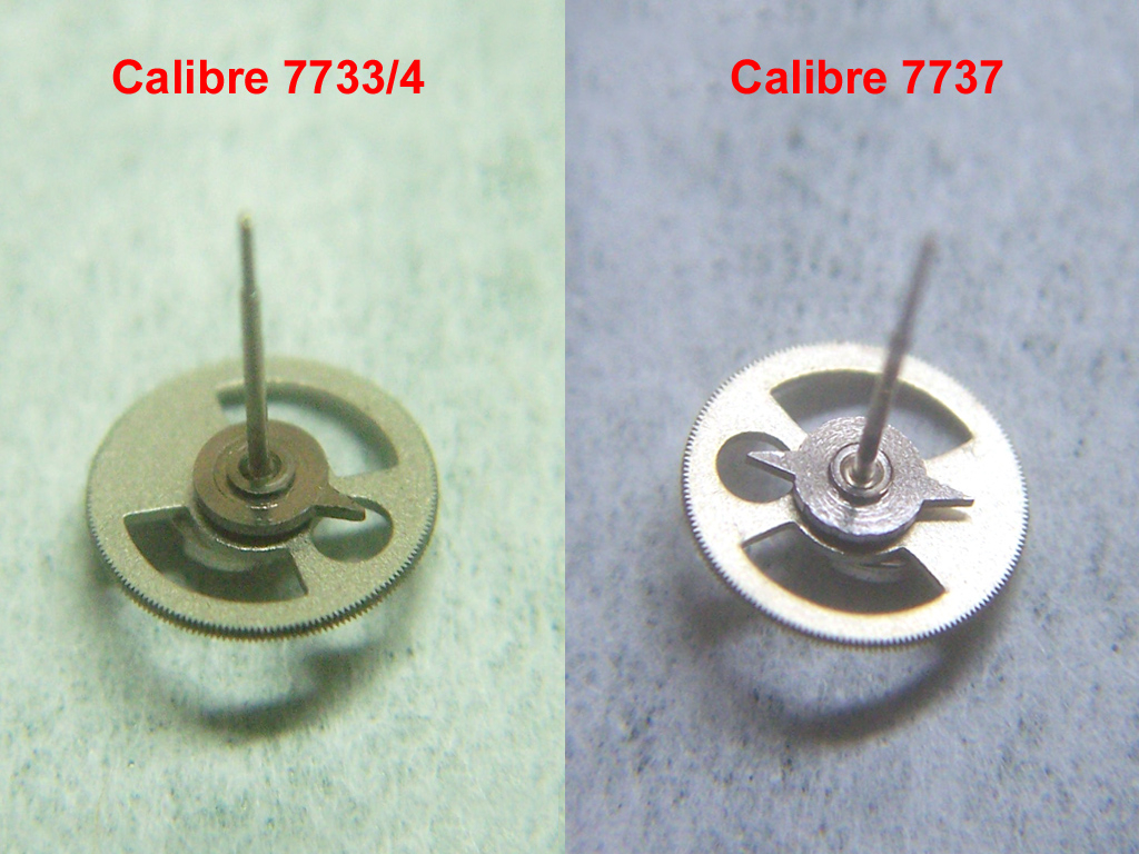 The Memosail is powered by a 17-jewel Valjoux 7737 manually wound mechanical caliber. It is a Valjoux caliber 7733/4 but with a modified center chronograph wheel that uses two fingers instead of one. Basically, one finger would move the the disc forward once every minute, and so the second finger was added directly across from the other (see comparison below) allowing the Memosail disc to advance once every 30-seconds.
