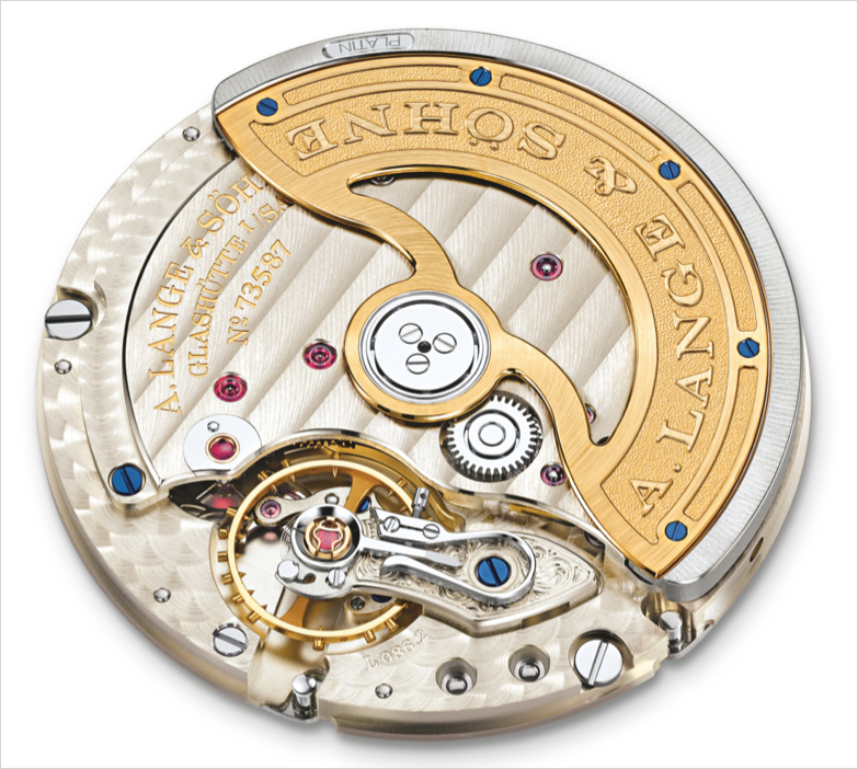 An in-house Lange balance spring is used and features a precision beat adjustment system with lateral setscrew and whiplash spring. The movement has 31 jewels, 268 parts, a lever escapement, a 72-hour power reserve, and runs at 3 Hz.