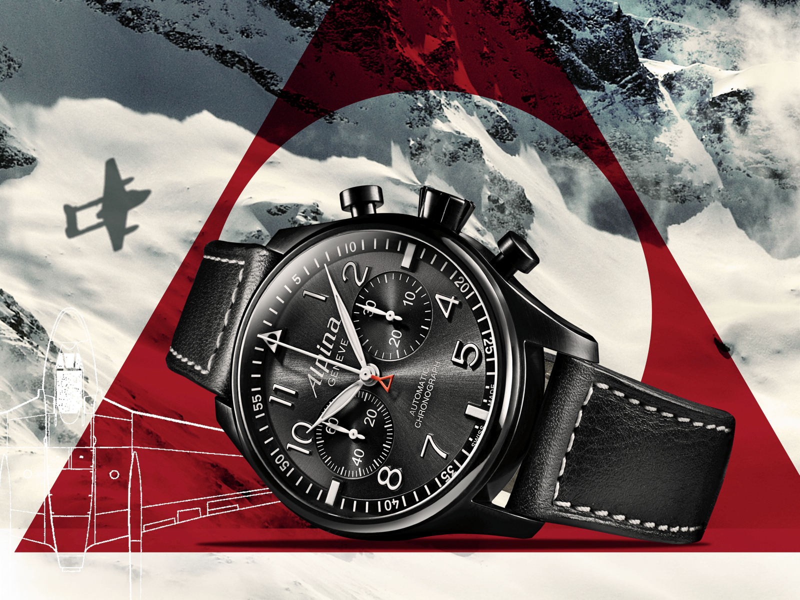 The leaf-shaped hour and minute hands are white with luminous material. The hours are marked by applied luminous Arabic numerals, indexes, and a triangle at 12. The chrono second hand is white with a red Alpina counter-weight. Chronograph start/stop and reset functions are controlled by black PVD coated pump pushers. Winding and time setting are controlled via a black PVD steel Pilot crown.