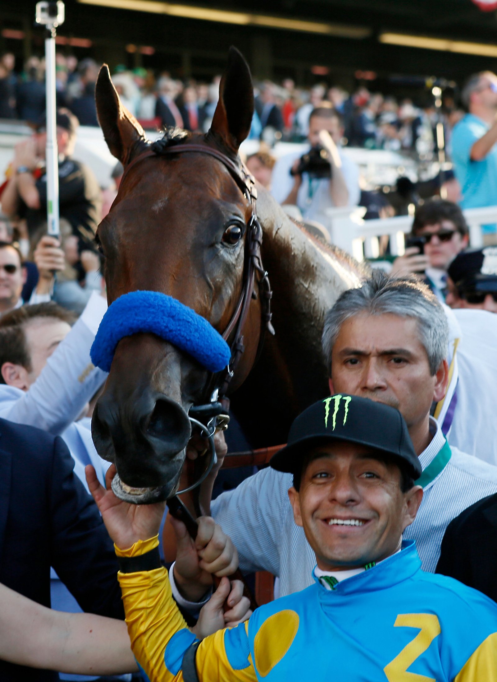 Jockey, Victor Espinoza with American Pharaoh after their historic win