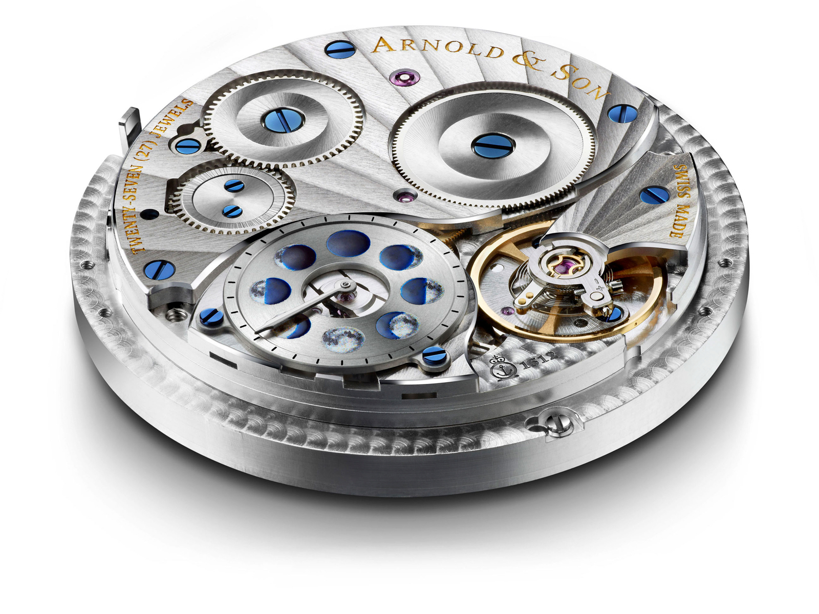 Inside is an exclusive Arnold & Son mechanical hand-wound movement (caliber A&S1512). It features a double-barreled movement good for a maximum of 90 hours of power reserve. The nickel-silver components movement has been rhodium-plated. The bridges have a sunray Geneva striped decoration (Côtes de Genève rayonnante), the mainplate has a perlage finish, the screws are blued, and the wheels have a snailed finish. Furthermore, all the bridges have manually chamfered and polished bridge edges. (Ref. 1GLAS.U02A.C122S)