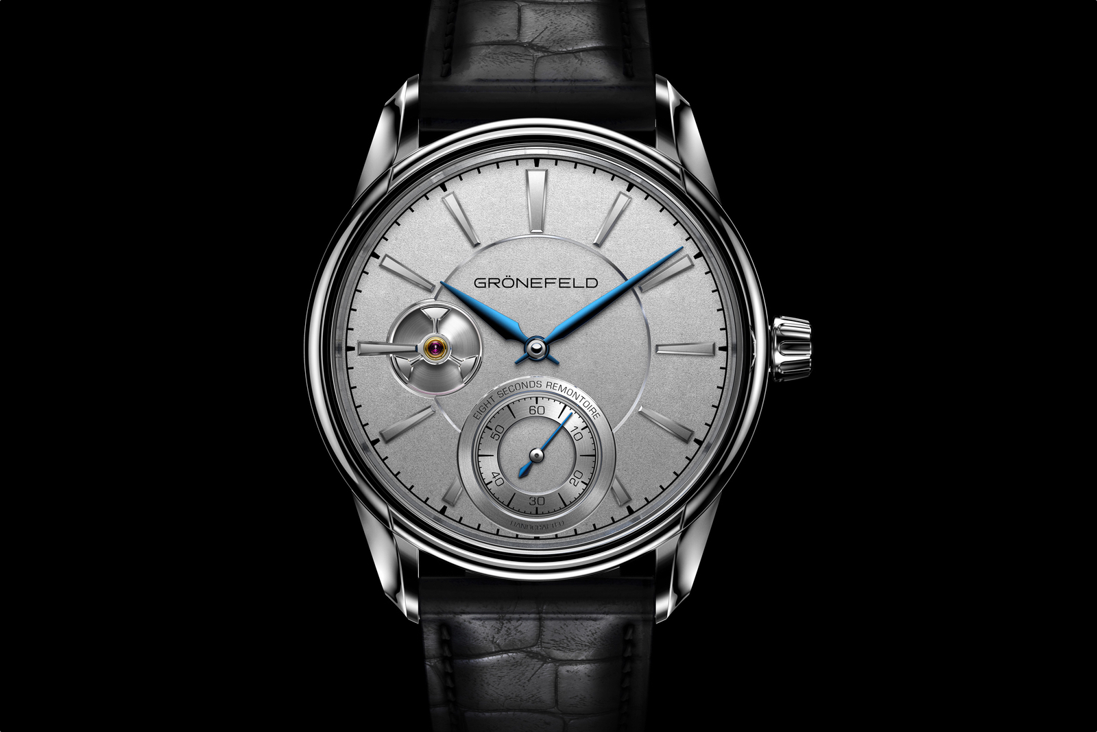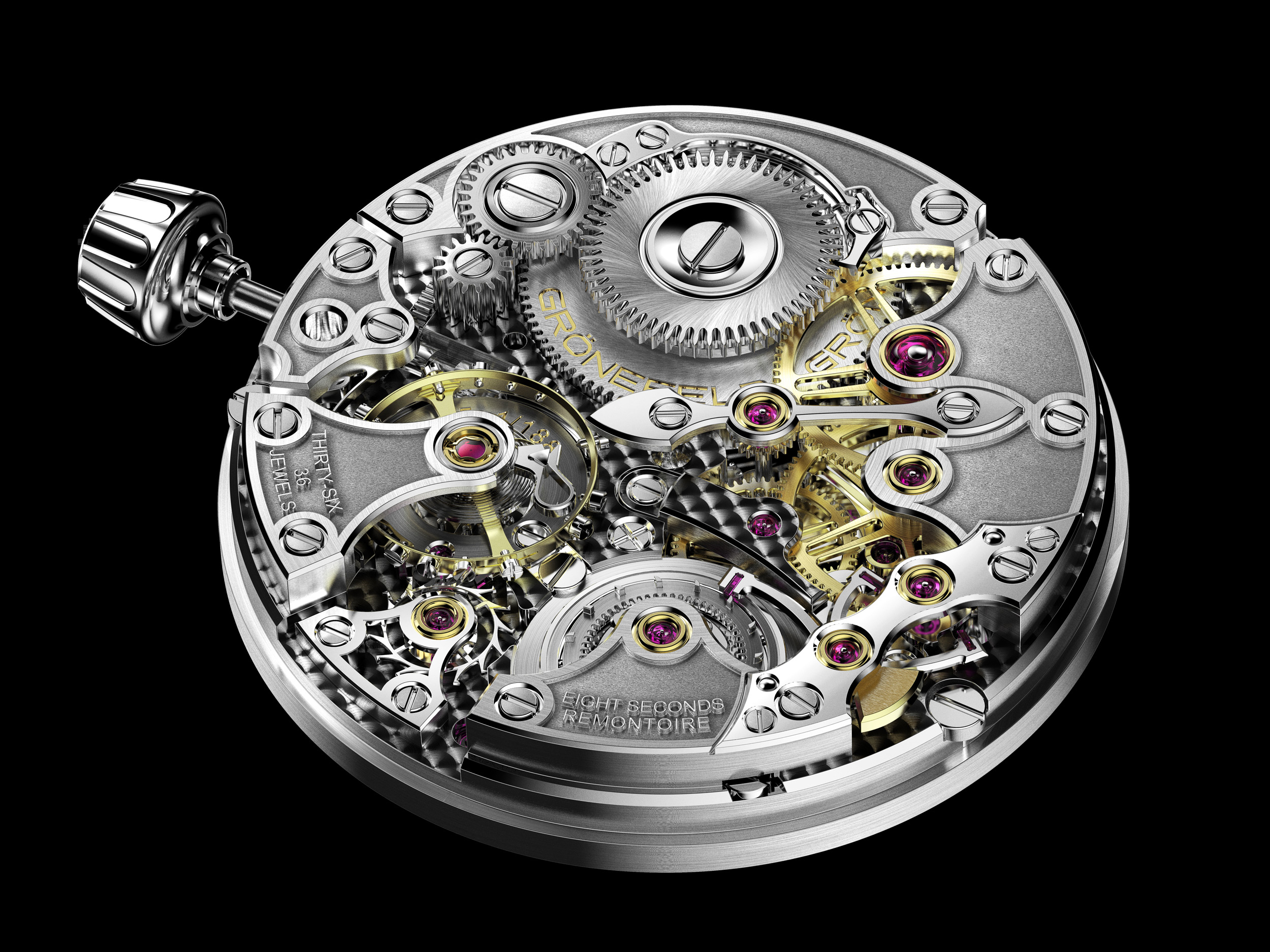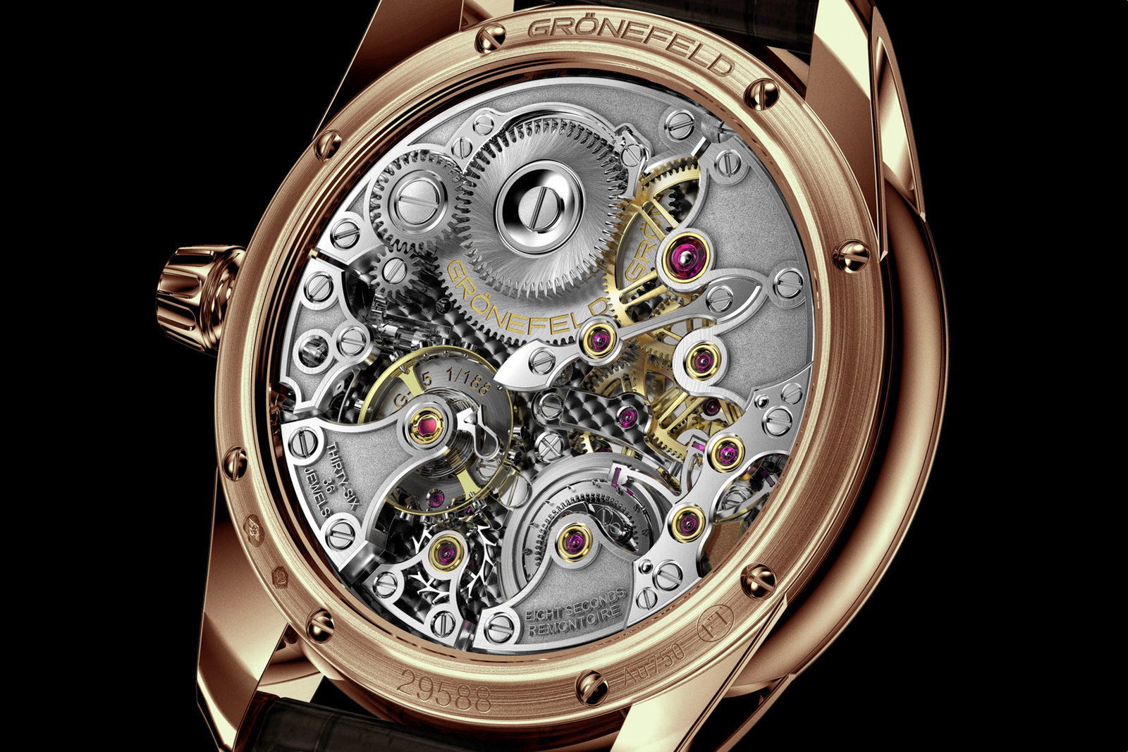 The caseback is engraved with “Grönefeld” and the individual number. 8 white gold security screws hold the back in place. The crown is in solid gold with engraved logo. Water-resistance is 30 meters.