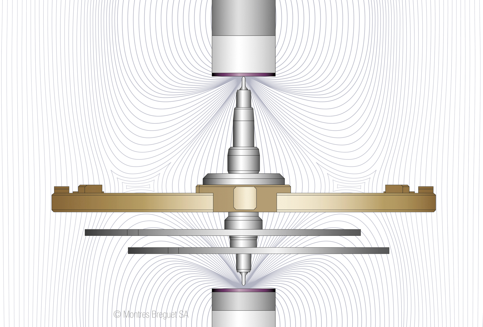 If you are wondering how the magnetic forces, which typically ruin a watch’s rate results, do not undermine the accuracy of caliber 574DR. It is because the magnets in the pivot system are sized perfectly so that the forces are localized and do no affect other metallic components. “The magnetic pivot consists of a carbon-steel balance- staff and a ‘rare-earth’ magnet behind each end- stone. One of the magnets is stronger than the other so that the balance-staff is in permanent contact with the endstone on the dial side and thus appears to be suspended,” according to Breguet.