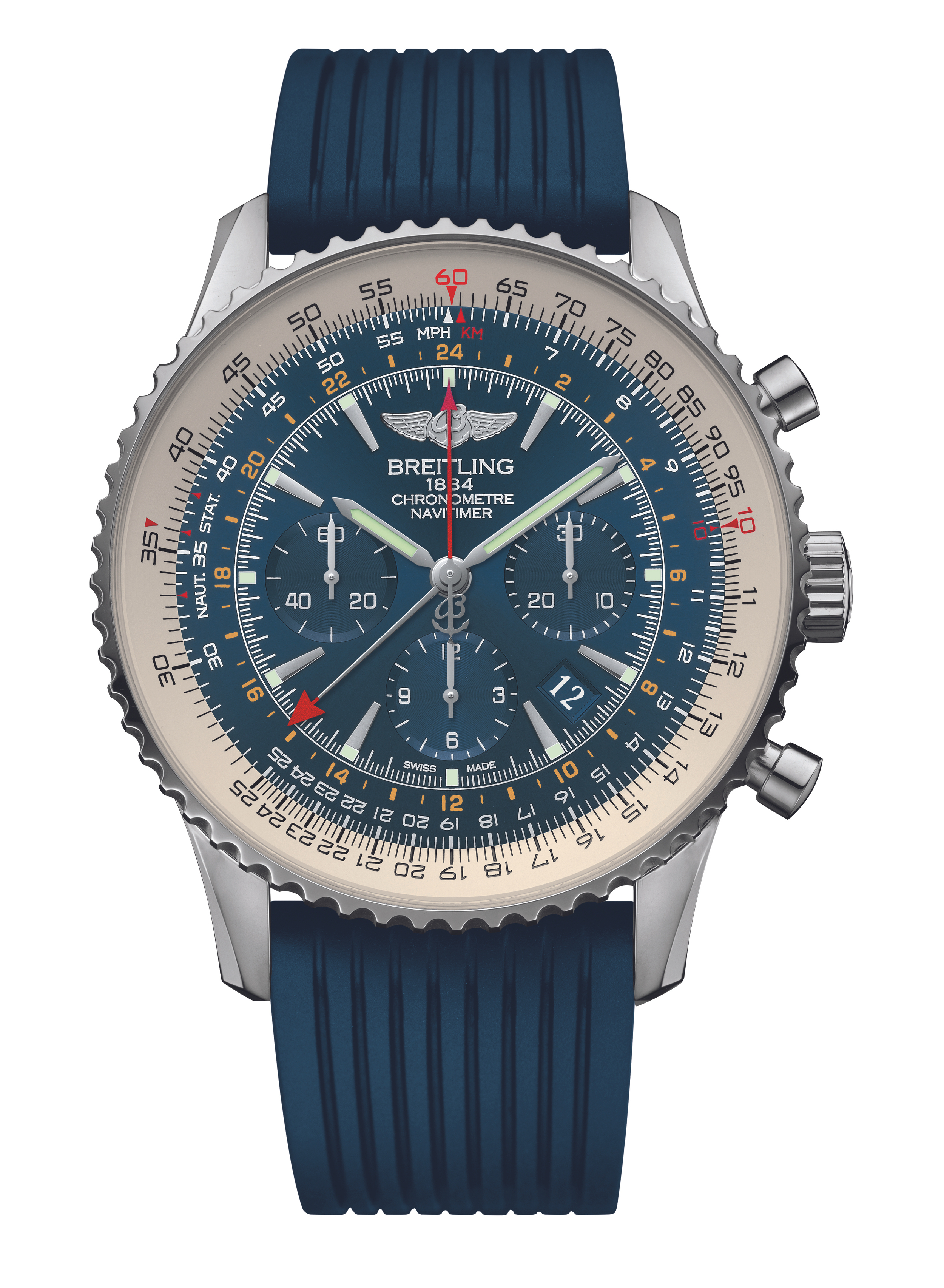The case is steel and measures 48 mm in diameter. An exhibition caseback allows viewing of the movement. Water-resistance is 30 meters. The Breitling Navitimer GMT Aurora Blue will be sold as a limited edition of 1,000 pieces.