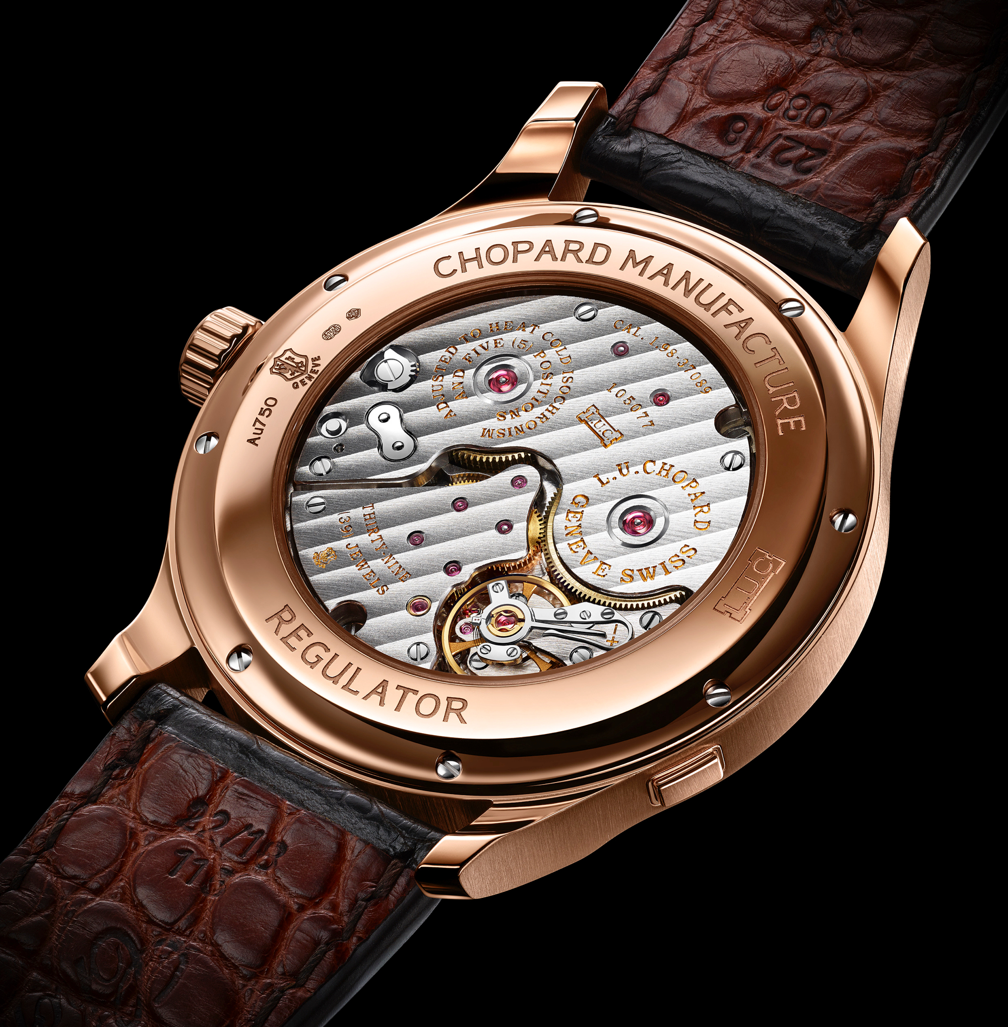 The L.U.C. Regulator is powered by a hand wound L.U.C. manufacture movement (caliber L.U.C 98.02-L). Uniquely, the movement features 4 mainspring power barrels (called Quattro®) for a total of 216 hours of power reserve, all in a 4.9 mm thick form factor.