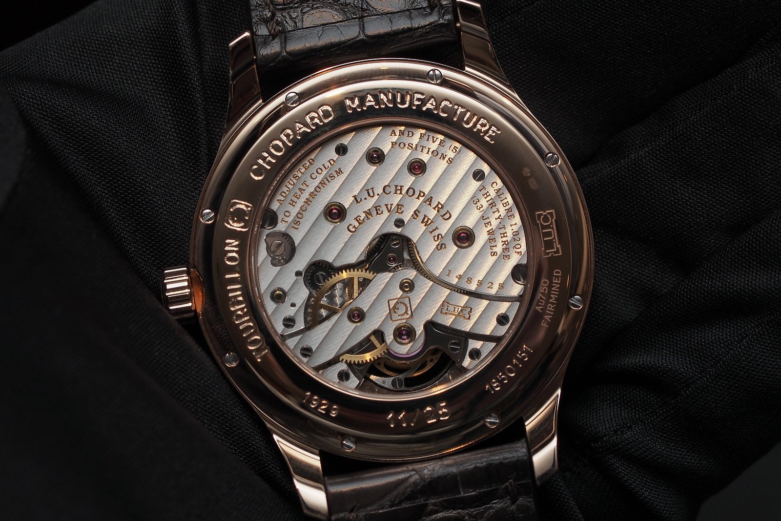 The watch is powered by a L.U.C. 02.13-L1 manually wound caliber that has manually finished Geneva stripes on the bridges, and perlage on the main plate, all visible through a clear caseback. It is available in a limited series of 25 pieces.