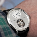 Although the case and movement share a genetic bond as they were made for each other, they are flanked by other elements that seem to operate self-sufficiently: to the West, a glass excrescence houses the tourbillon carriag,e while to the East, two symmetrical casings house the winding mechanism and the seconds, at 2 o’clock and 4 o’clock respectively.