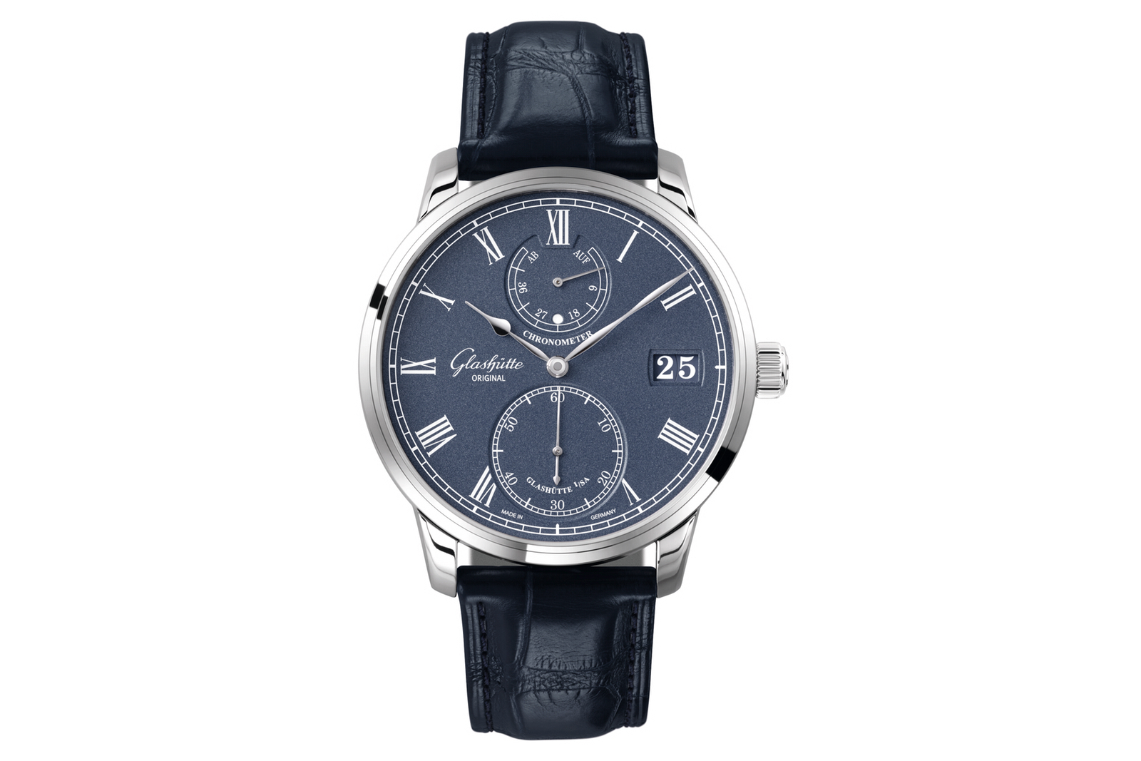 Presented in a white gold case measuring 42 mm x 12.47 mm, the bezel, top of the case and lugs, are fully polished, with a brushed-finish around the caseband. The new blue grain Senator Chronometer is paired with a blue Louisiana alligator leather strap, with stainless steel foldover buckle (21/18 mm). Water-resistance is 50 meters. (Ref. 1-58-01-05-34-30)