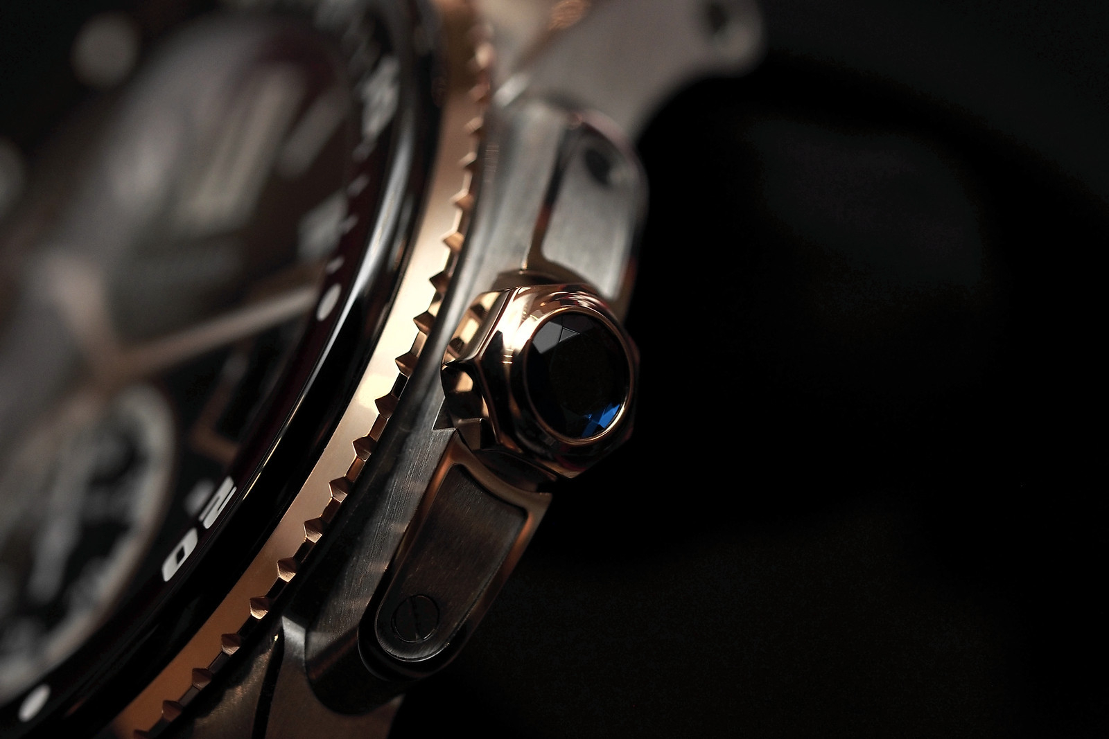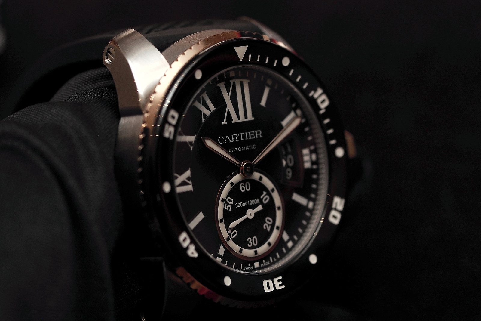 The Calibre de Cartier Diver is a true ISO 6425 dive watch and is water-resistant to 300 meters, has a uni-directional 60-minute dive scale bezel and a luminous treatment on the hands, markers and bezel. The bezel is treated with a scratch resistant black ADLC (Amorphous Diamond Like Carbon) coating. The crown is set with Cartier’s signature synthetic blue spinel jewel. The Calibre de Cartier Diver is paired with a black rubber strap or metal bracelet.