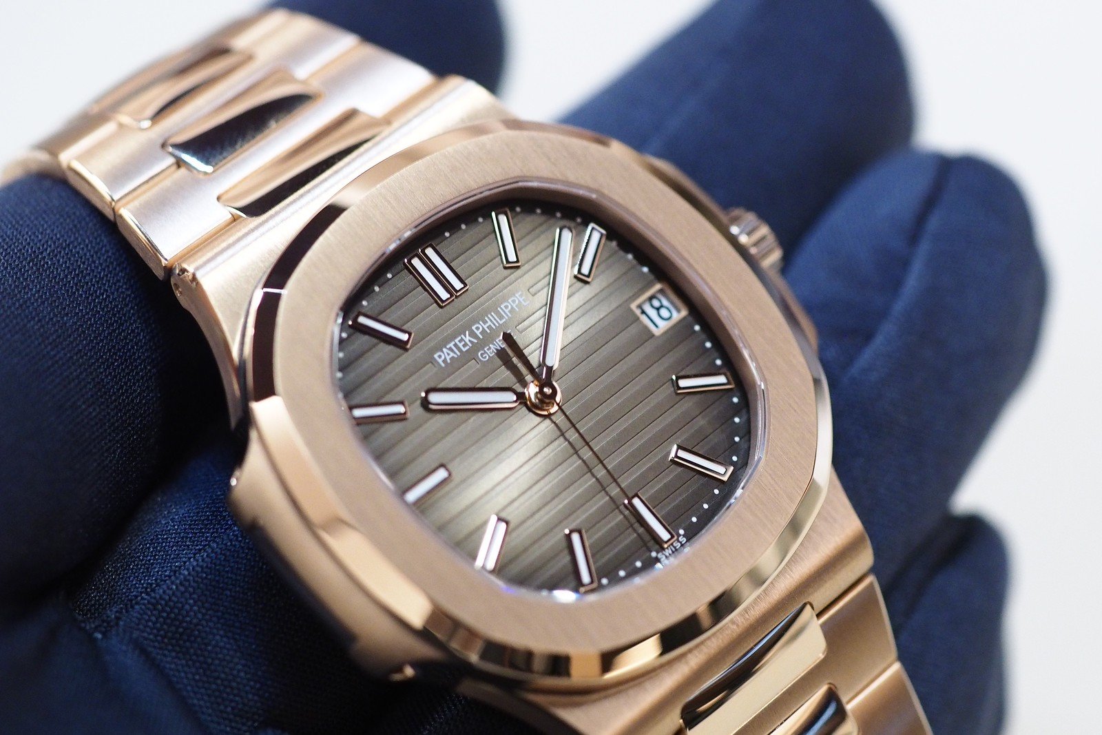 The new Patek Philippe Nautilus 5711/1R-001, with its 40 mm polished and satin-brushed rose gold case, comes with a light/dark brown graduated dial with a vertical guilloche pattern. The way the light hits the dial gives it a light grey to dark brown appearance, depending on your viewing angle.