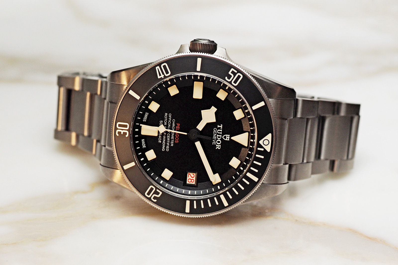 As someone that is right-hand dominant (and that wears my watch on the left-hand), the Tudor Pelagos feels like the current right-hand Pelagos model, but with the crown on the left. And being honest, I have to say that it is mentally hard to look at the crown on that side after every single other watch I have ever owned has always had the crown on the right. That said, I do like the new look, particularly the subtle application of beige lume, the red Pelagos text, and the alternating red/black numerals of the “roulette” date wheel. It gives the watch a different vibe – a new colorway if you will – that I prefer over the more neutral colors of the existing Pelagos, so I hope this same look makes its way to the right-hand drive version.