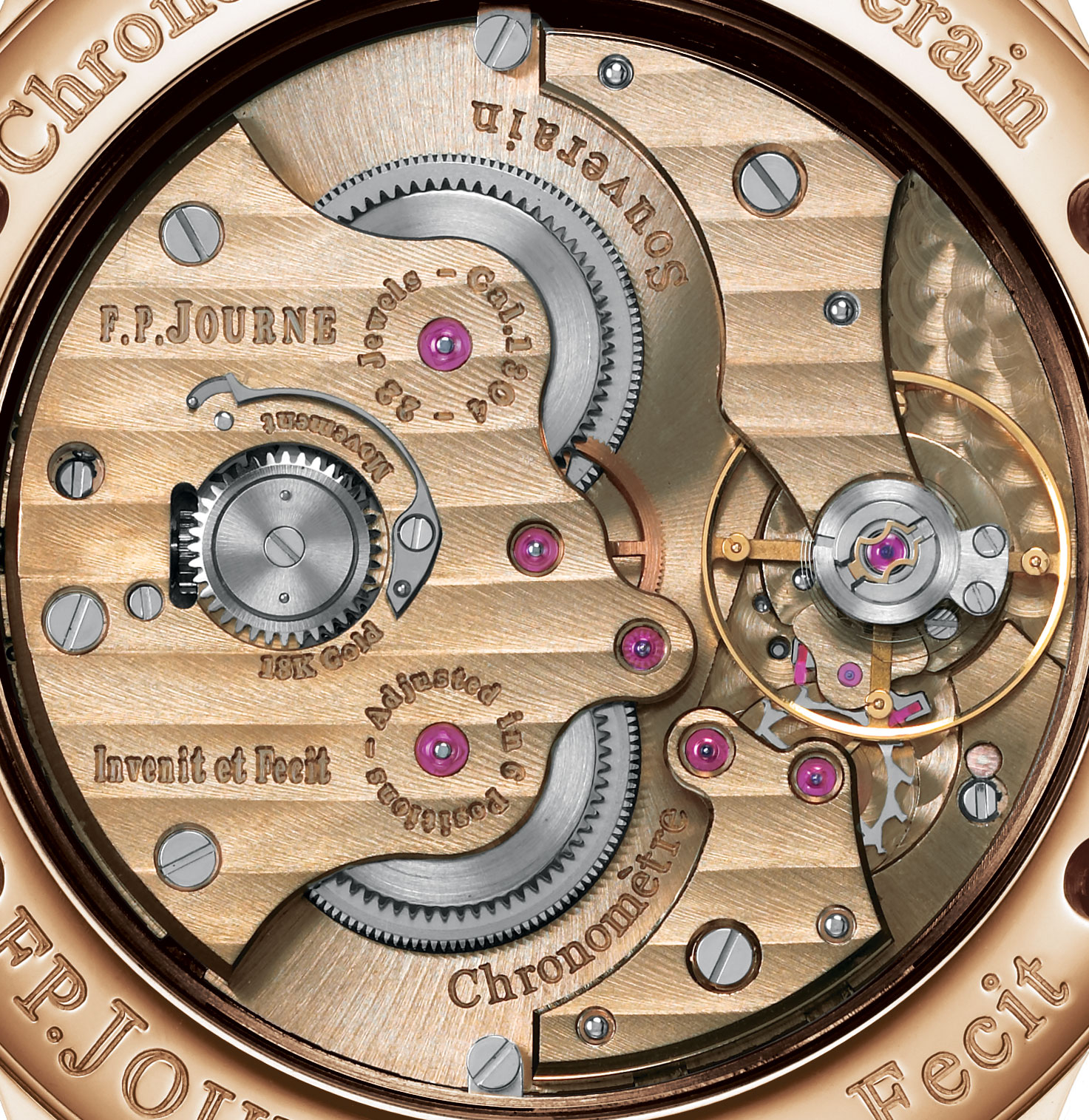 Inside, is caliber 1304, a manually wound double barrel movement with a 56-hour power reserve and Journe’s signature 18K rose gold main plate and bridges. The movement features exquisite hand finishing of components, including circular graining on the main plate and Geneva stripes on the bridges.