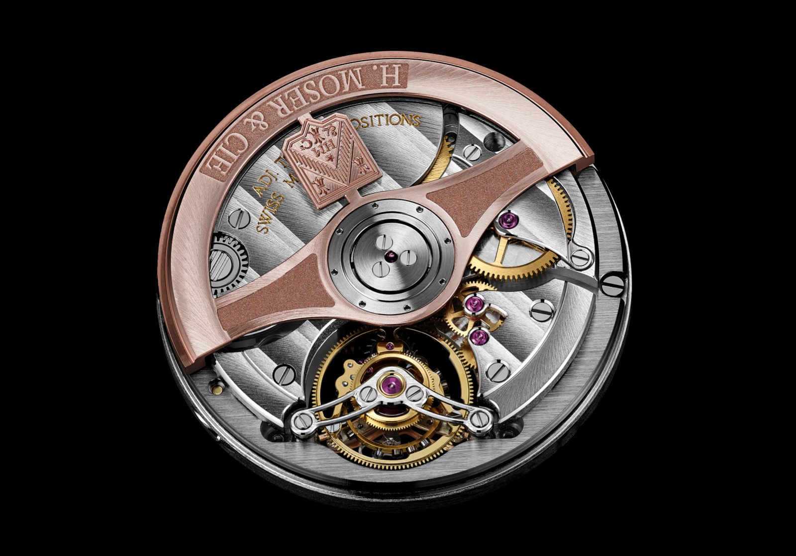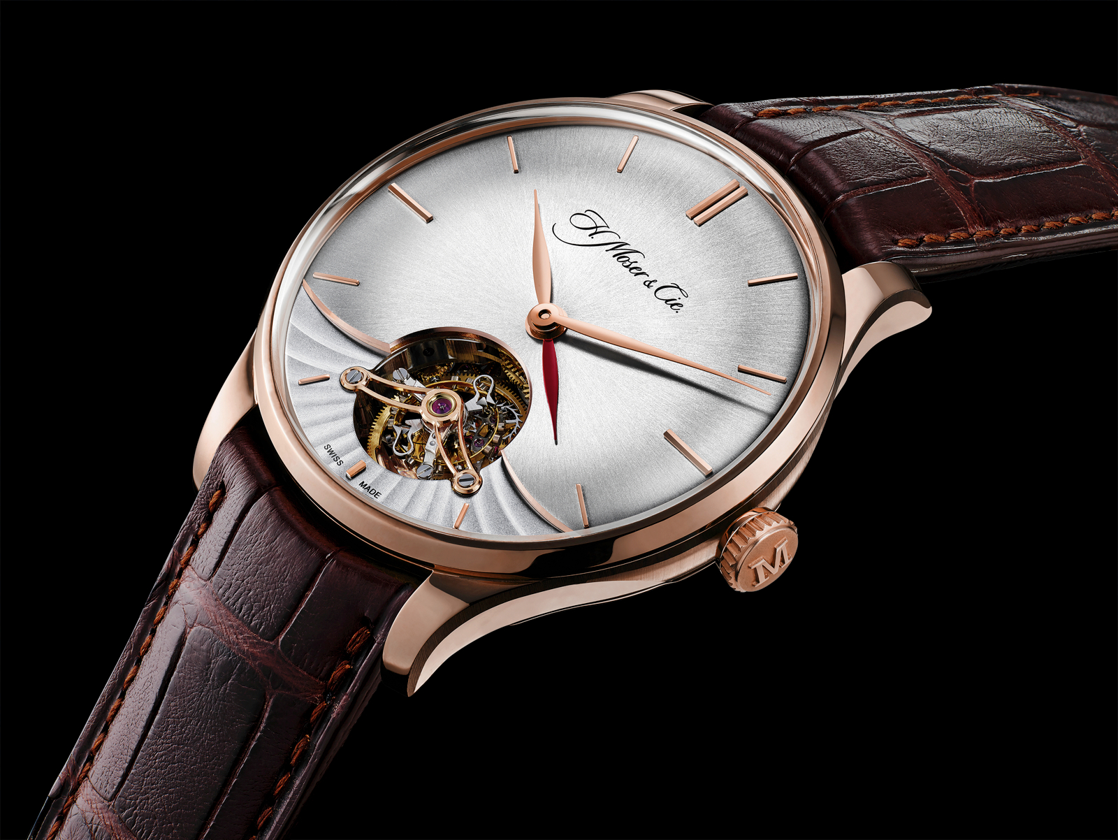 solid 18K red gold rotor engraved with H. Moser & Cie hallmark, Moser teeth for all wheels and pinions, an Original Straumann Double Hairspring, and a power reserve of 72 hours. In addition to being able to look into the movement through the tourbillon aperture on the dial side, the see-through caseback also affords a view through the back.