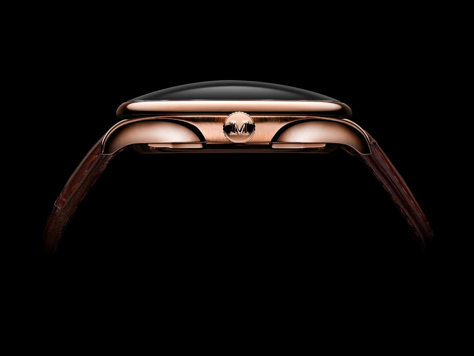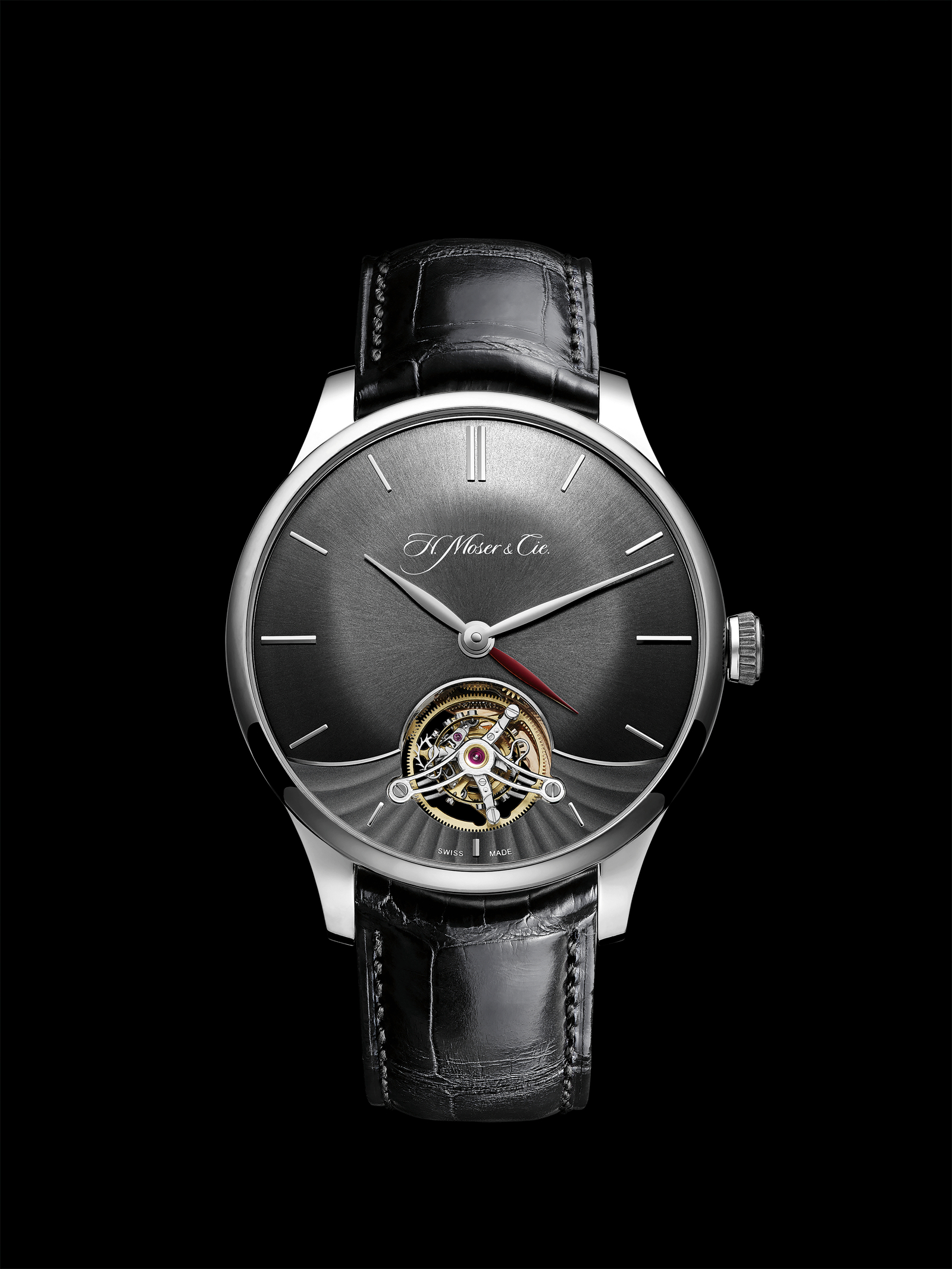 The Venturer Tourbillon Dual Time is paired with a hand-stitched brown or black alligator strap and matching gold clasp, engraved with the Moser logo. (Ref. 2802-0200 – white gold ardoise dial, 2802-0400 – red gold fumé dial, 2802-0401 – red gold argenté dial)