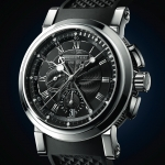 A double chronograph (rattrapante or split-seconds) features an additional central seconds hand that during normal operation runs synchronously with the main chronograph seconds hand. However, by pressing the pusher at 10 o’clock, the additional seconds hand activates stops to record intermediate times. Press the split-second pusher again and the hand returns to its position in sync with the normal chrono seconds hand.