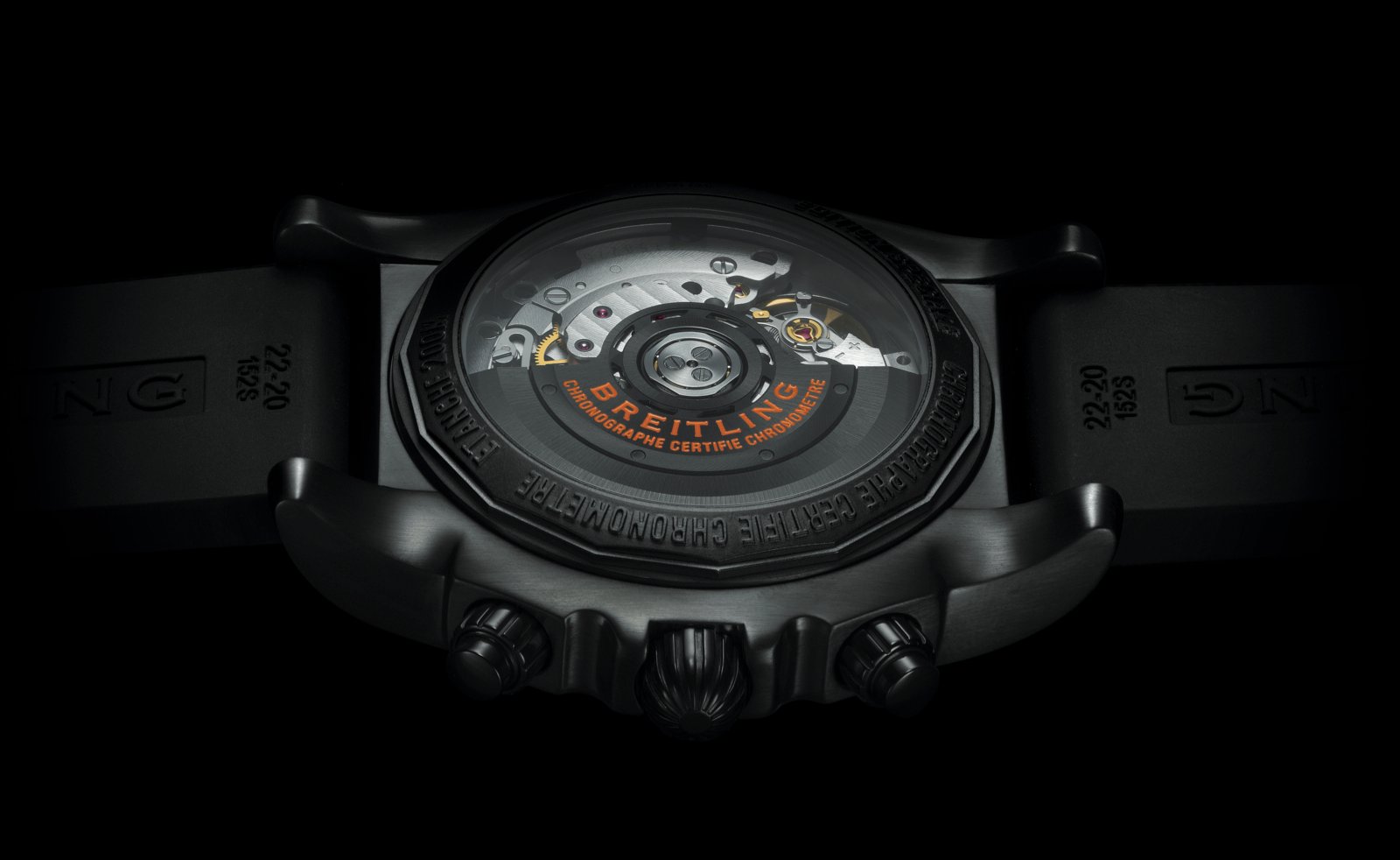 On the back is a sapphire crystal that shows off the Breitling caliber B01 in-house chronograph movement. Notably, the oscillating weight has been blackened and features orange text to match the color scheme of the watch.