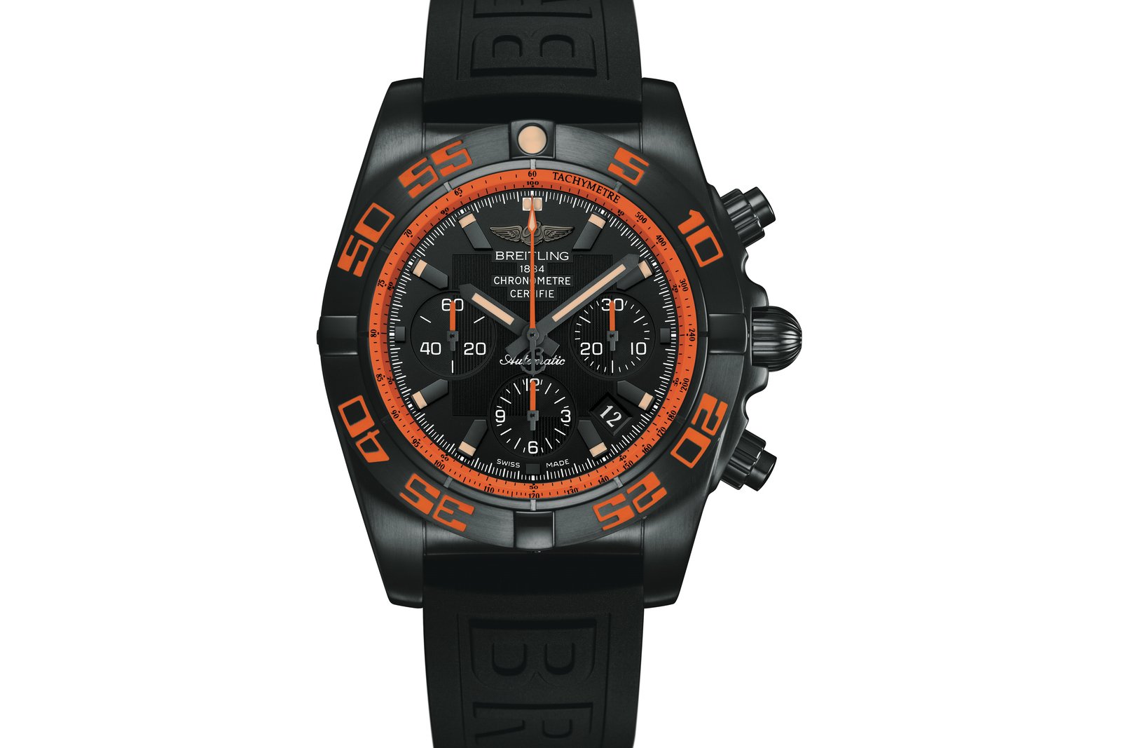 The Chronomat 44 Raven in black steel is the newest addition to the Breitling Chronomat collection. The watch is presented in a 44 mm diameter black steel case, with range accents on the bezel, tachymeter ring, subsidiary display hands, and the chronograph central seconds hand. The orange accents clearly stand out against the matte black dial, indexes, hands, bezel, and case.