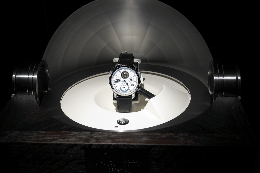 The Grande Cosmopolite Tourbillon (Ref. 89-01-03-93-04) is presented in a beautifully crafted wood case with a stainless steel globe that rotates to reveal the timepiece. When the timepiece is inside an integrated mechanism winds the timepiece.