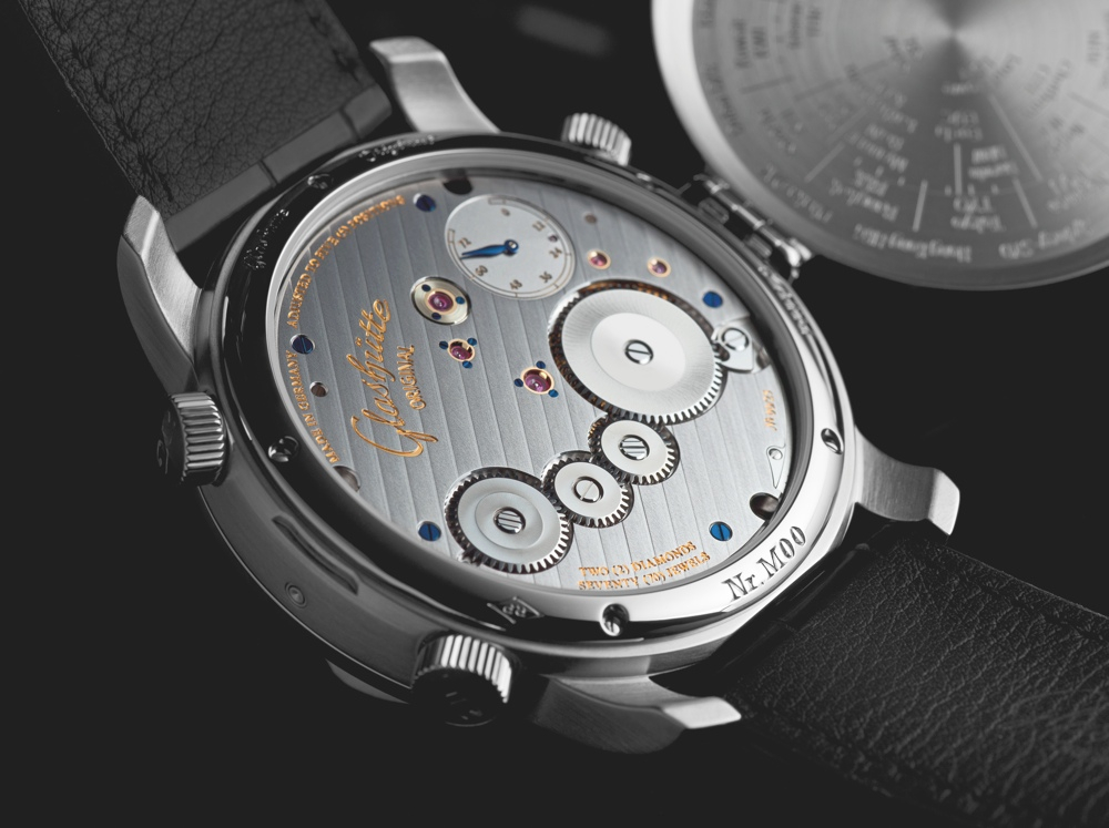 The movement is exquisitely finished with: beveled edges, polished and brushed steel parts, screwed gold chatons, blued screws, Breguet spring, wheel-train bridge with Glashütte ribbed finish, winding wheels with double sun burst decoration.