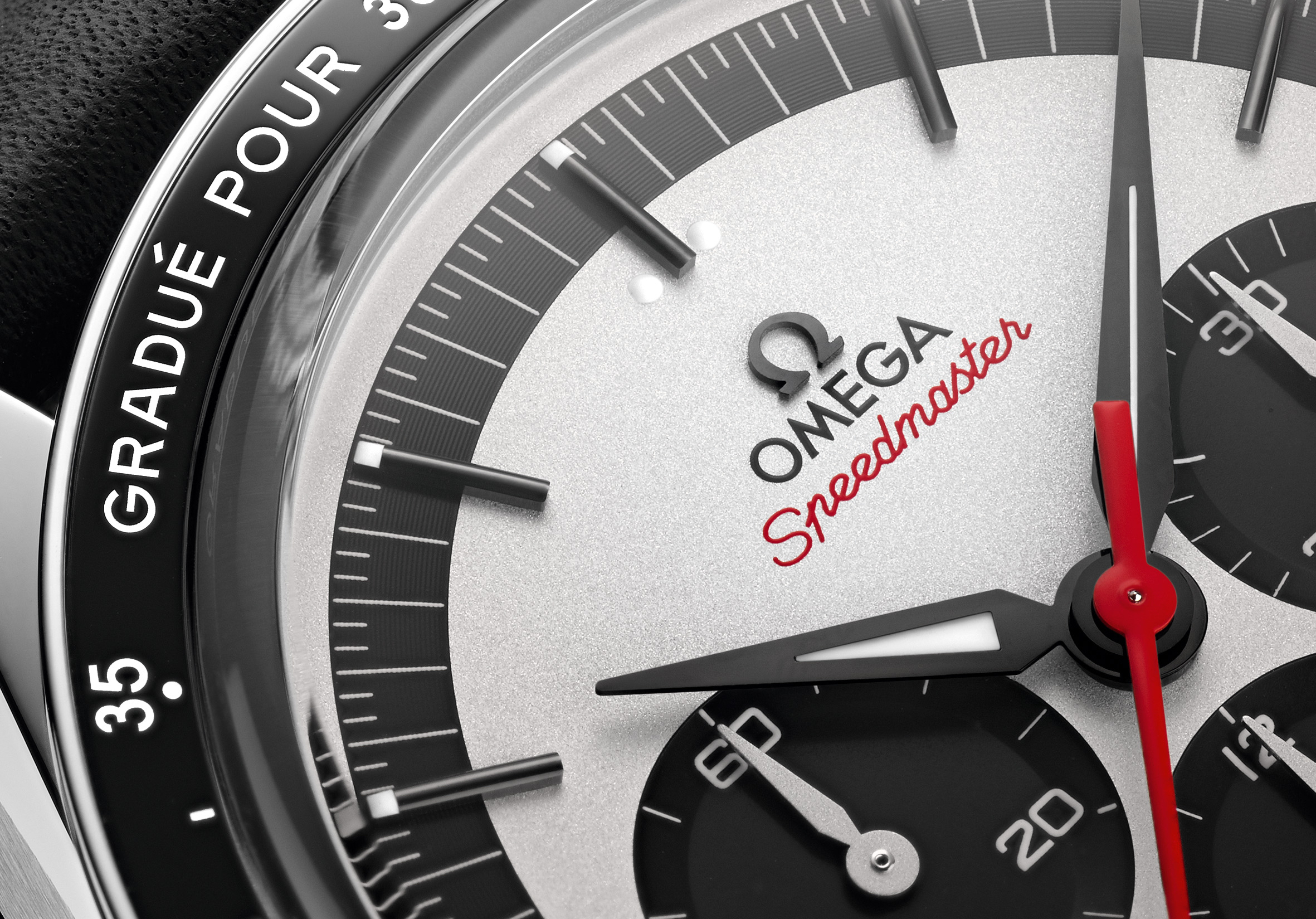 Another notable design change is the decision to switch from a matched lollipop second hand to a bright varnished red needle-shaped second hand. The red hand and printing of “Speedmaster” on the dial are about right for the aesthetic of the watch, which also comes with a sporty black micro-perforated leather strap with white rubber lining.