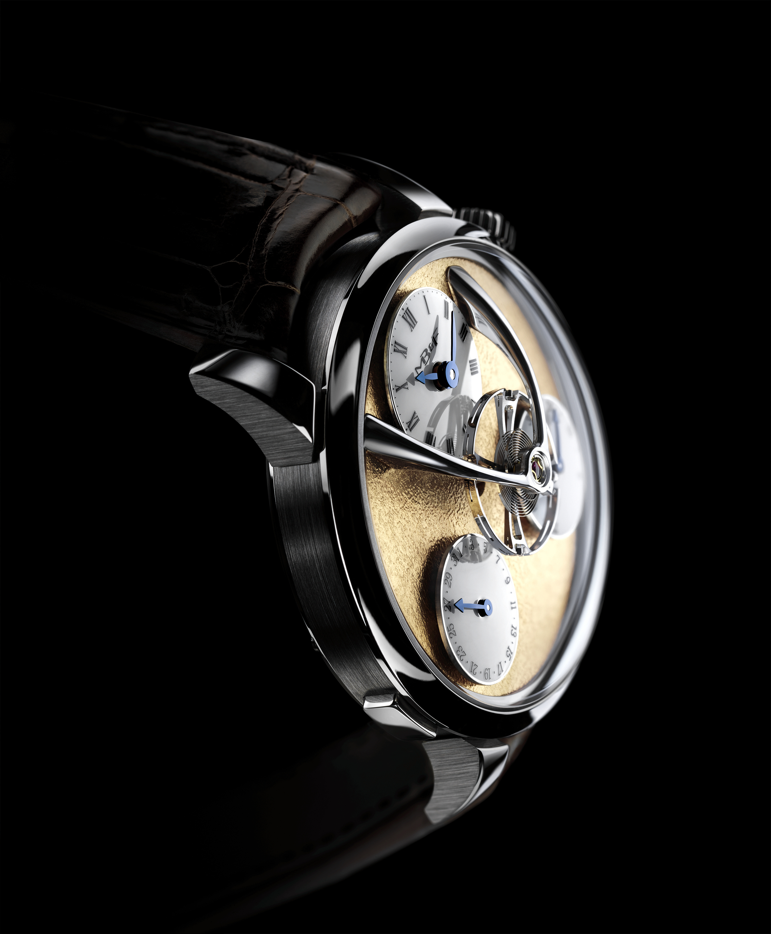 All versions come with a white gold case measuring 44 mm x 17.5 mm, and you can choose one of four dial variations limited to 18 pieces each: blue frosted dial with a rhodium-plated movement, ruthenium frosted dial with a darkened ruthenium-plated movement, red gold frosted dial with a red gold-plated movement finish, and yellow gold frosted dial with a yellow gold-plated movement finish.