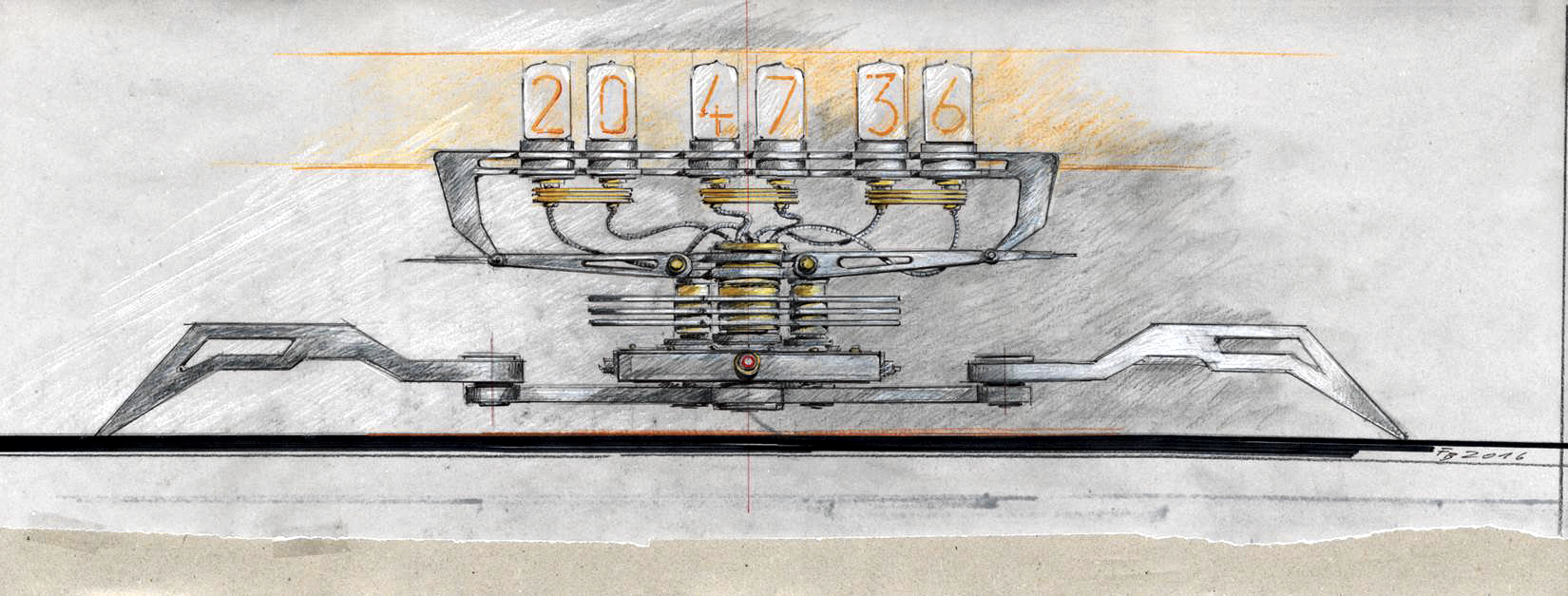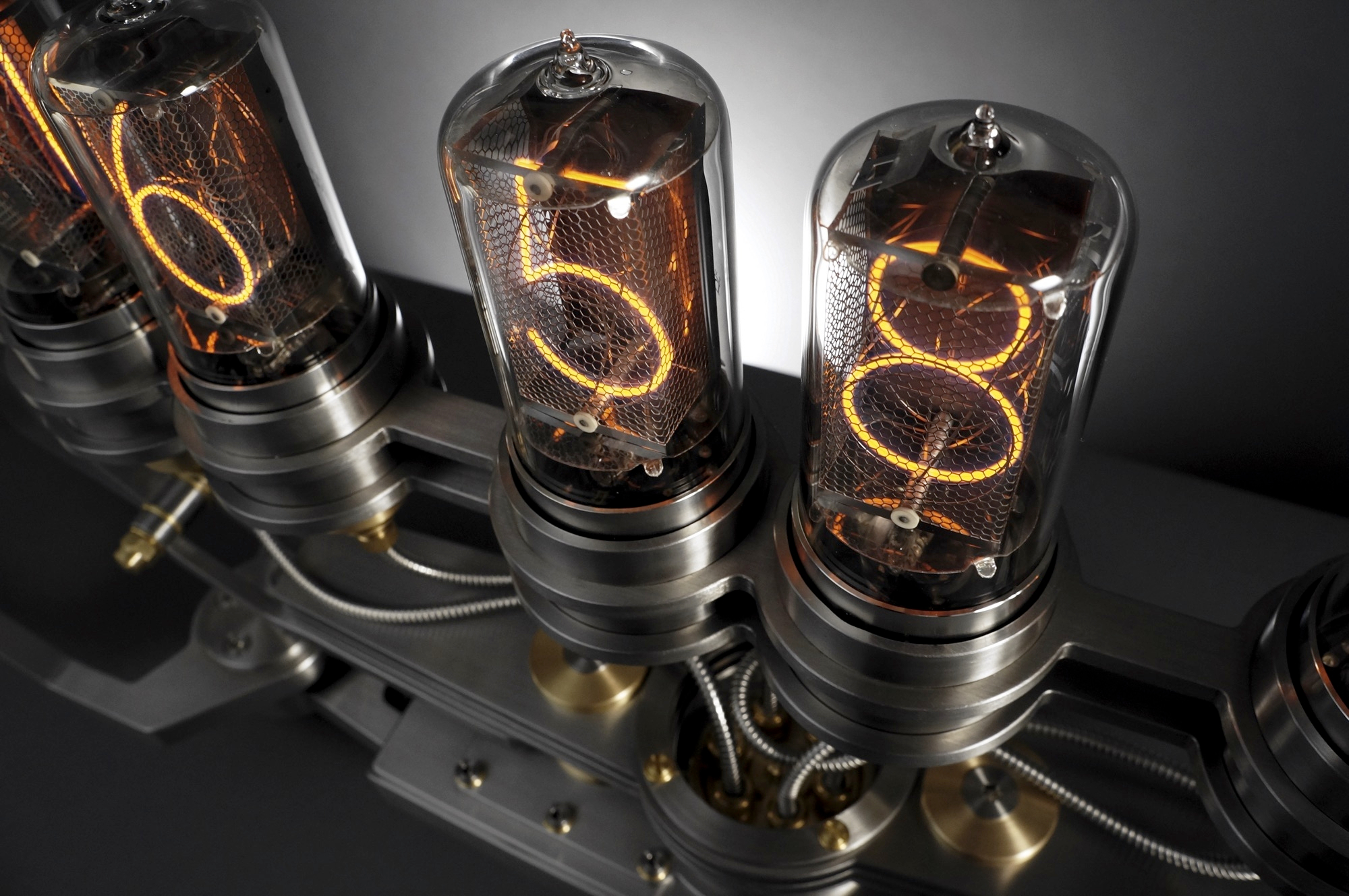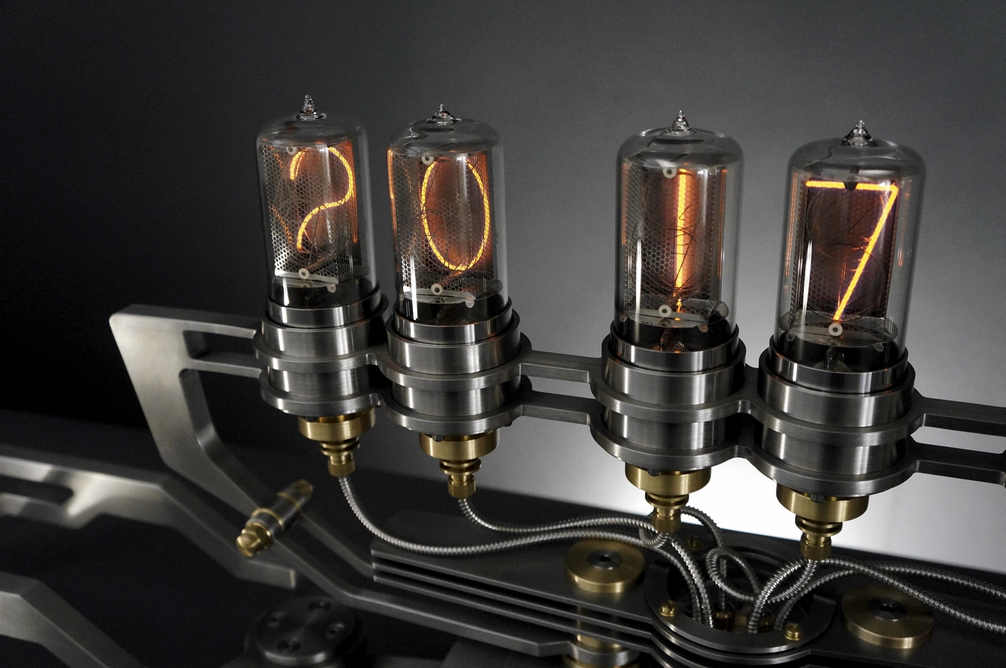 With its 47.24-inch long structure in Buchwald’s signature “heavy engineering” style, the Nixie Machine II is handcrafted out of burnished steel and brushed brass. Each of its glowing six digits is displayed via modern Nixie tubes – also known as cold cathode displays – presented as three pairs for hours, minutes, and seconds.