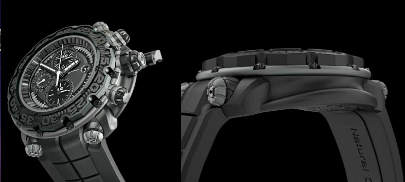 The Nubeo Black Mamba collection’s main draw, other than being backed by one of the NBA’s best, is its 131-component case. The Black Mamba features a 48 mm case made of titanium treated with DLC. The bezel is ceramic. Rubber is used on the crowns, pushers, and the strap. Water-resistance is 100 meters. Black Mamba watches start at $25,000.