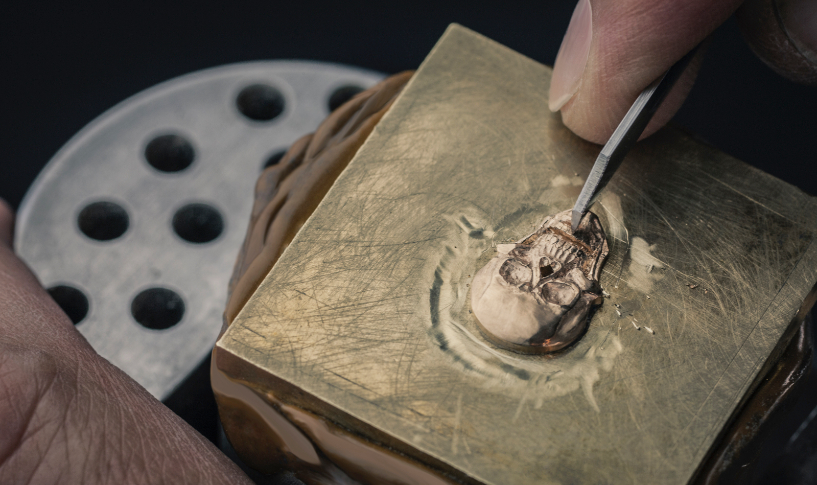 In addition, at the top of the dial sits a skull in hand-engraved solid gold. At the bottom of the dial is a flying 60-second tourbillon. And on the sides of the dial are power reserve indicator (left) and accuracy indicator (right). Further, the watch is a regulator, meaning all the functions are separated, such a the central minutes display, which is compeletly separate from the hour display.