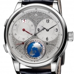Hours and minutes are displayed by steel baton hands. At 6 o’clock is a continuously running subsidiary seconds display. Chronograph counters located at 9 and 3 o’clock display 12-hours and 30-minutes, respectively.
