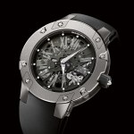 The main plate, bridges and balance cock are made in grade 2 titanium with a black PVD coating which increases the rigidity. A double power barrel configuration helps improve torque stability over long periods of time. Additionally, by using more rotational turns, the friction and pressure on the teeth is therefore reduced, resulting in improved performance. Carbon fiber is used on the hour and minute tracks, the index dots are filled with luminous material.