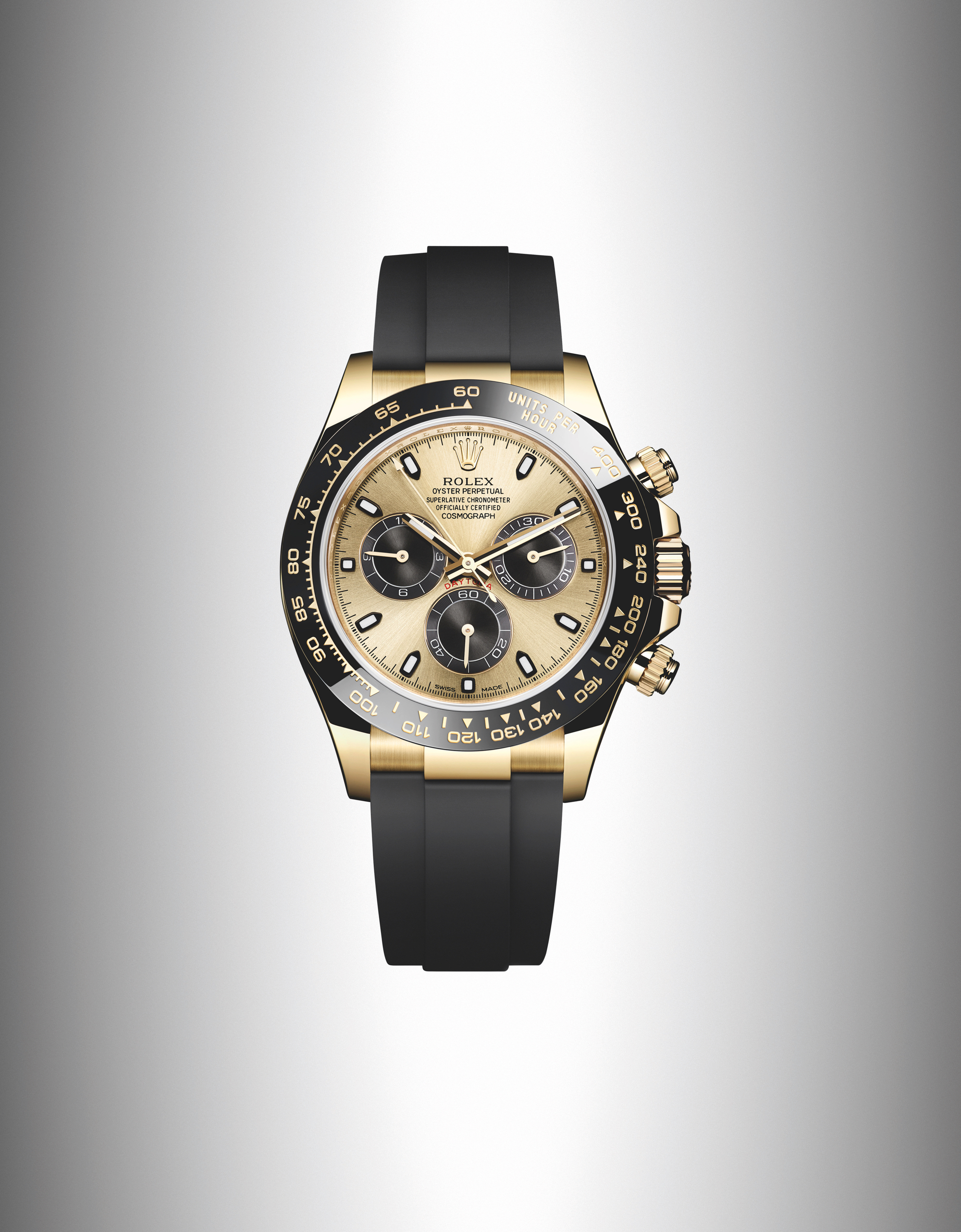 This year at Baselworld, Rolex debuted three new gold Daytonas with Oysterflex rubber bracelets. The precious metal case options are 18K yellow, rose, or white gold.