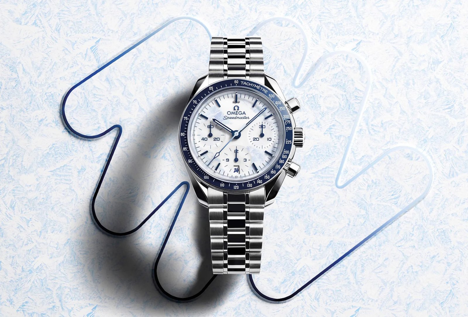 For this limited edition Winter Olympics 2026 model, Omega gave it a special white varnished lacquered dial with a light-blue frost pattern inspired by the “26” motif of the Milano-Cortina 2026 emblem. The hands and indices feature a blue treatment, and the subdials feature a stamped guilloche azurage technique (raised concentric circles).