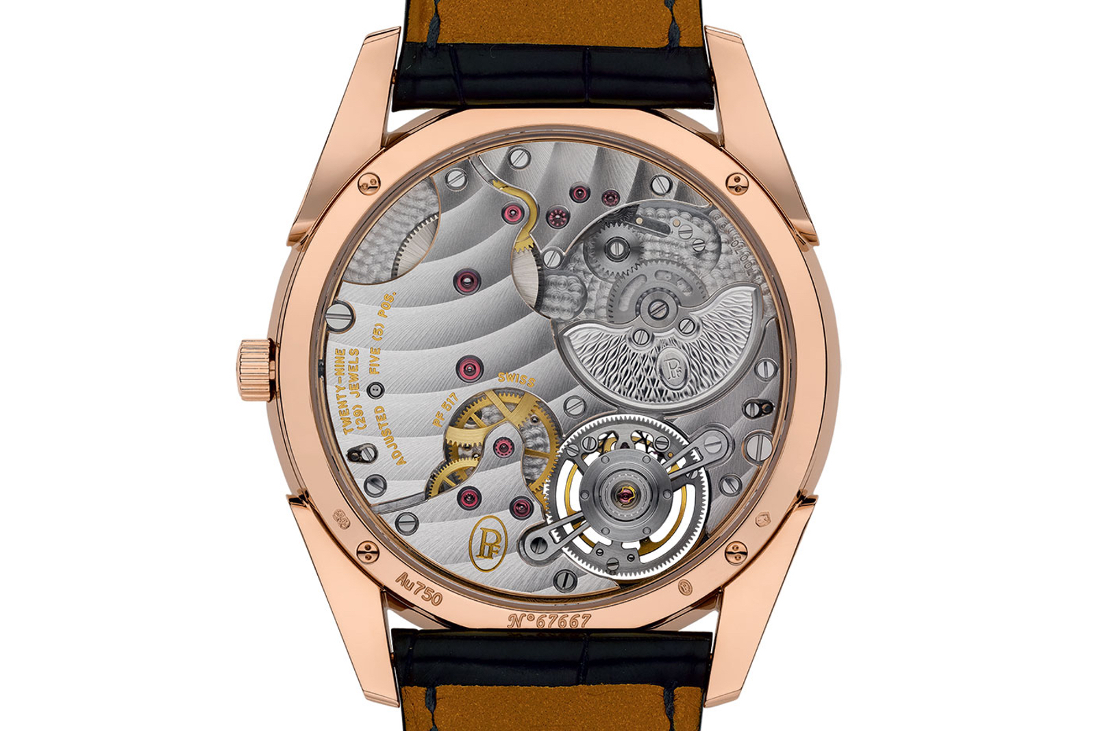 This flying tourbillon, which is supported by only a single bridge (regular tourbillons are supported by two bridges), required a highly sophisticated ball bearing system for mounting, so as not to add thickness to the movement.