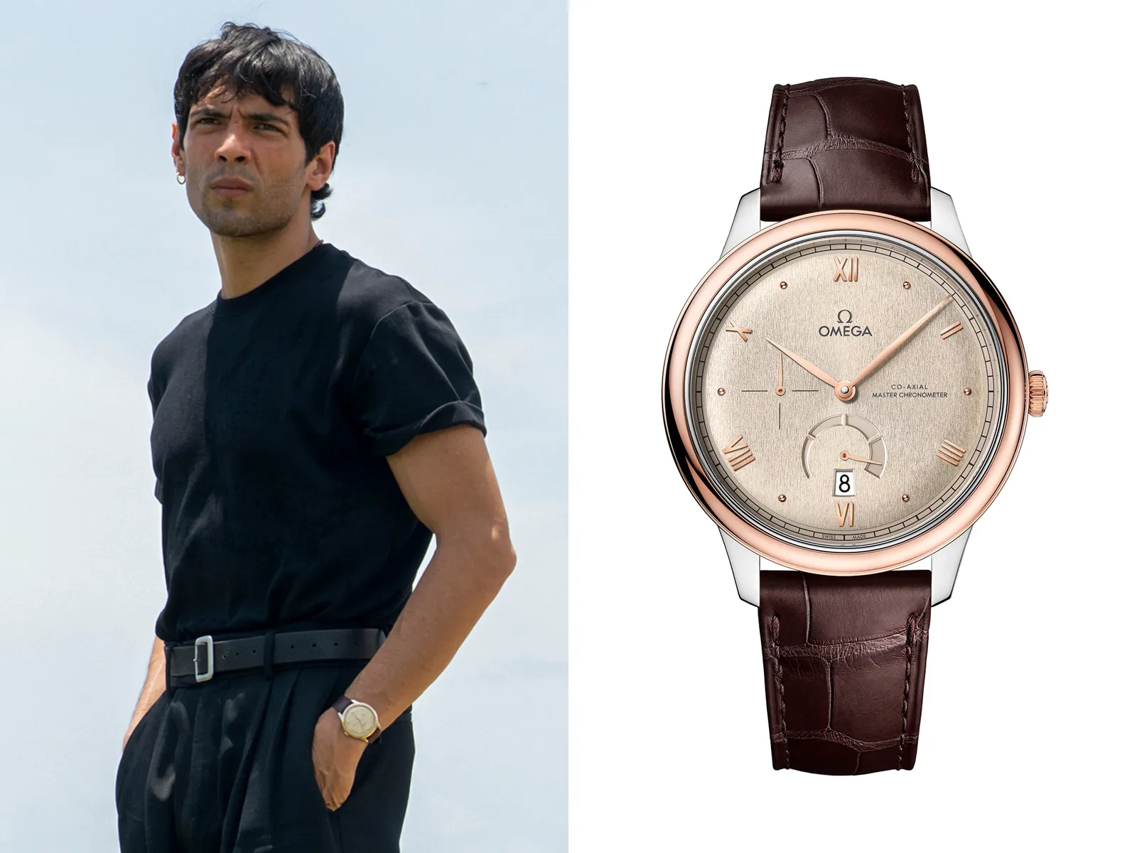 Diego Calva, who plays Teddy Dos Santos, wore an Omega De Ville Prestige (Ref. 434.23.41.21.09.001), which measures 41 mm in diameter and features a stainless steel and Sedna™ gold case (Omega’s proprietary 18K rose gold), that retails for $9,800.