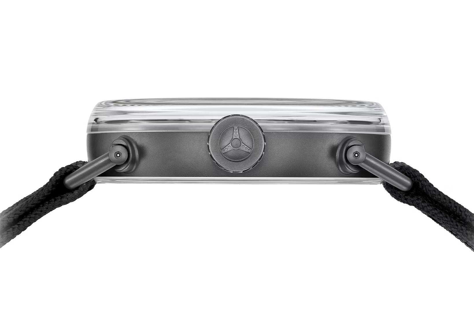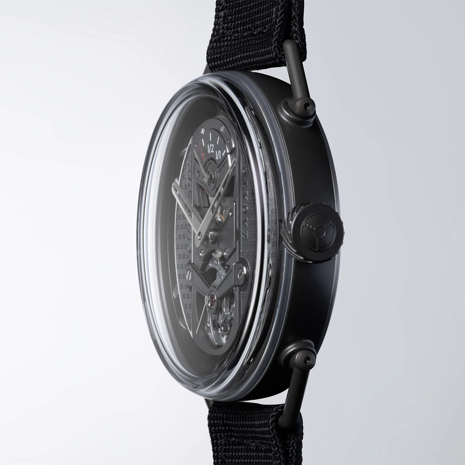 The Zagato Lab One Concept is presented in a lightweight anthracite-colored ceramized titanium case with a distinctive aesthetic befitting a concept timepiece. The 42 mm x 11.5 mm beadblasted ceramized titanium case, has been treated with an electroplasma oxidation technology, making it highly scratch-resistant (around 1000 Vickers hardness) while maintaining exceptional lightness. It weighs just 43.2 grams, including the strap.